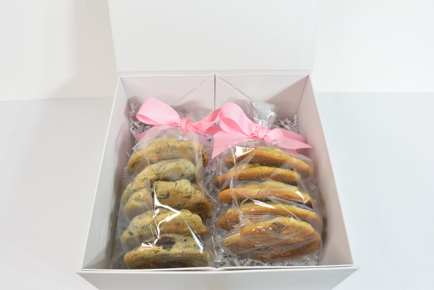 Our beautifully packaged premium cookie gift boxes come with 2 packages of 5 cookies each. Each gift box is tied with a bow on the front with white ribbon for a premium look, a note card, and mailed inside our shipping bags. Our gift boxes will surely impress!